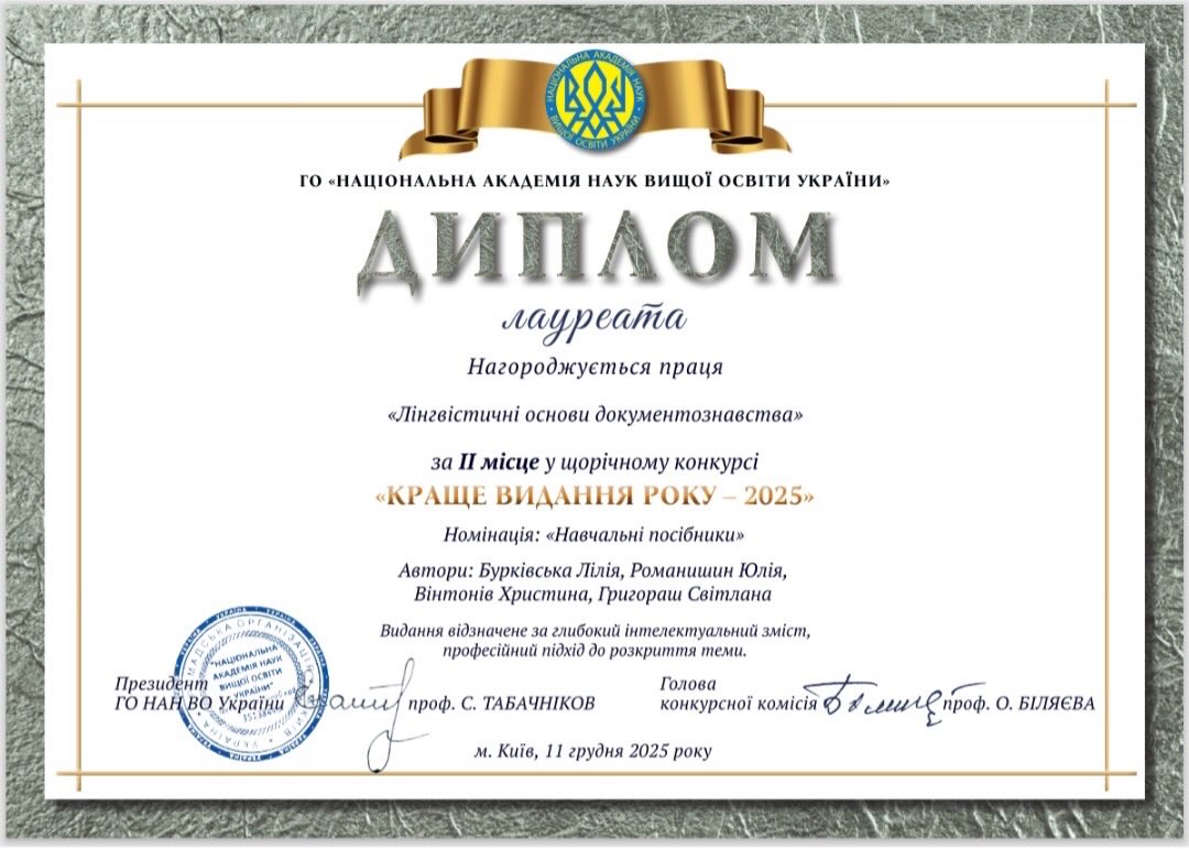 Навчальний посібник колективу авторів кафедри – Лілії Бурківської, Юлії Романишин, Христини Вінтонів та Світлани Григораш «Лінгвістичні основи документознавства» – здобув ІІ місце у конкурсі «Краще видання року – 2025». Видання відзначено за глибину змісту, наукову обґрунтованість та професійний підхід до розкриття тематики.