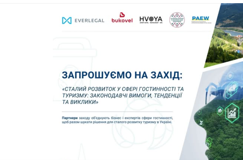 20.11. 2025 на базі готелю HVOYA (курорт Буковель) відбулась MEGAподія, яка об’єднала бізнес, експертів та представників індустрії: «Сталий розвиток у сфері гостинності та туризму: законодавчі вимоги, тенденції та виклики». Захід проведений з метою обговорення проблем та напрацювати рішень для сталого розвитку туризму в Україні.