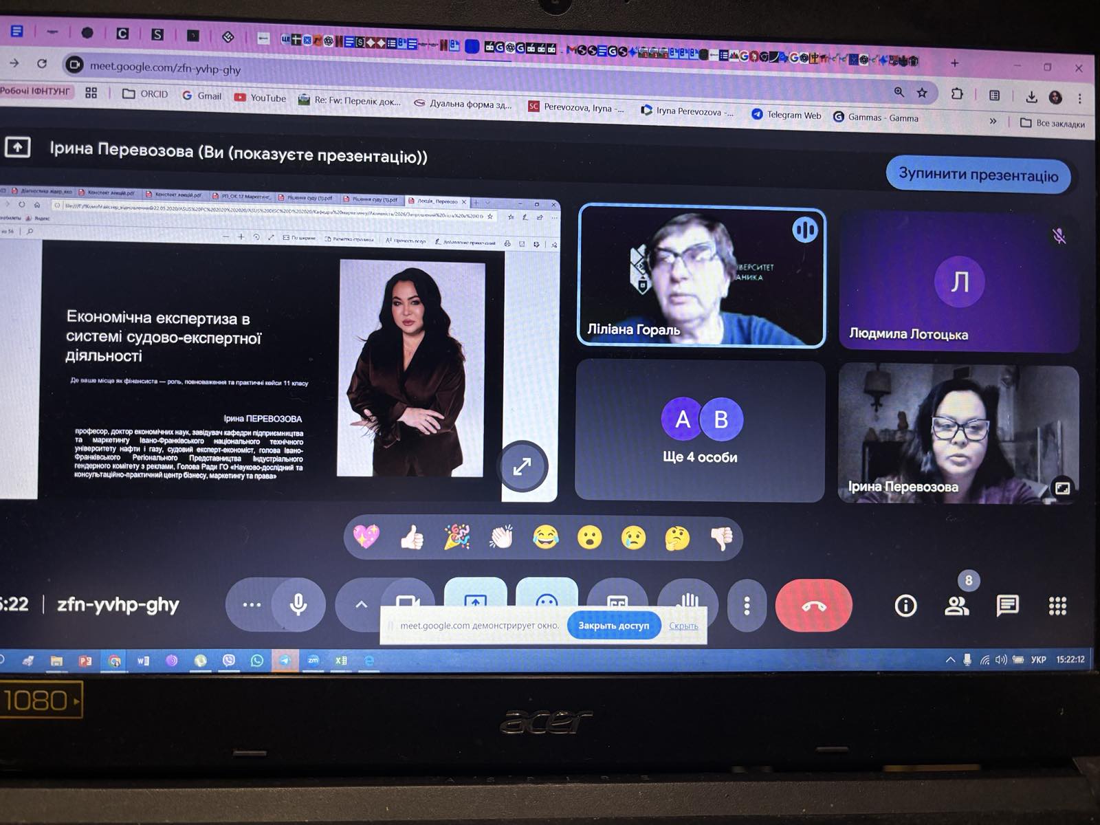 02 квітня 2026 року відбулася гостьова лекція завідувачки кафедри підприємництва та маркетингу ІФНТУНГ, судового експерта-економіста д.е.н., професора Ірини ПЕРЕВОЗОВОЇ для магістрів спеціальності «Фінанси» (група ФБС-М1) Карпатського національного університету імені Василя Стефаника на тему «Економічна експертиза в системі судово-експертної діяльності». Тема лекції стала не лише логічним продовженням навчального курсу «Експертна оцінка» (лектор Ліліана ГОРАЛЬ), а й практичним виходом у професійну реальність, де фінанси перестають бути лише цифрами і перетворюються на доказ.