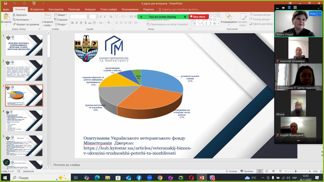Ветерани та ветеранки ЗСУ - це не лише Герої та Героїні на полі бою, а й Люди з величезним потенціалом у мирному житті. Аби підтримати їхній шлях до соціалізації та самореалізації після повернення, з 24 листопада 2025 р. в межах роботи Центру Ветеранського розвитку ІФНТУНГ, кафедра ПіМ долучилася зі спеціалізованим курсом з основ підприємництва до навчання ветеранів російсько-української війни та фахівців супроводу ветеранів.