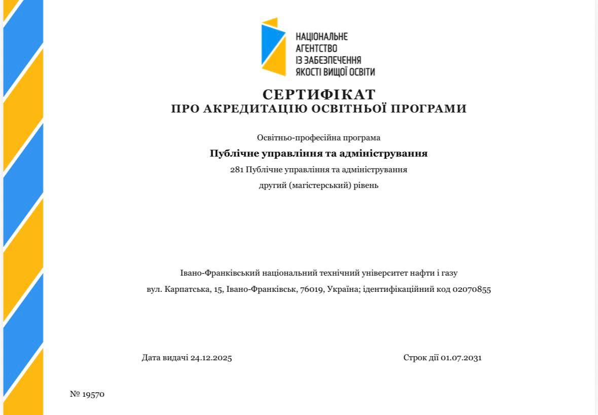Акредитація Нацагентства підтверджує відповідність програми державним стандартам вищої освіти, її якість, актуальність змісту, належний рівень викладання та орієнтацію на сучасні потреби публічного управління й адміністрування. Для здобувачів і здобувачок освіти це означає визнаний диплом, якісну підготовку та впевненість у майбутній професійній реалізації.