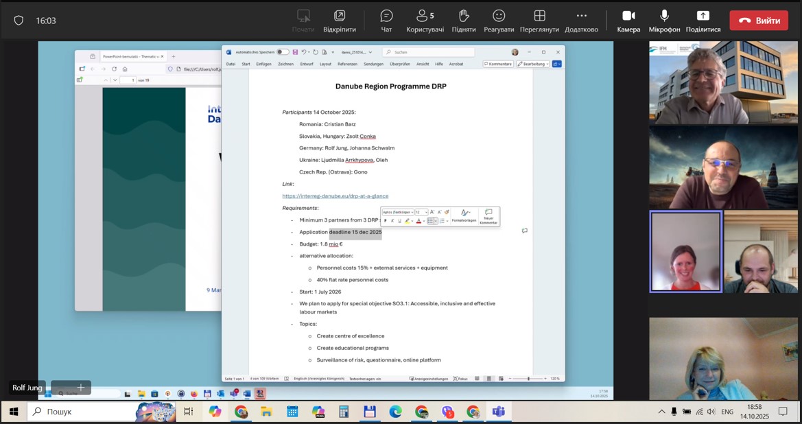 У понеділок 13 жовтня та у пятницю 17 жовтня тривали онлайн зустрічі друзів і партнерів, які обговорювали майбутній проєкт в Програмі Interreg Danuba. Умовою поточного конкурсу є обовязкове включення українського партнера, який водночас не можу бути Головним партнером в консорціумі. Тухнічні університети Клуж Напоки (Румунія), Кошице (Словакія), Кемптона (Німеччина) та ІФНТУНГ (Україна) плідно працюють та зустрінуться оффлайн в листопаді для продовження міжнародного співробітництва.