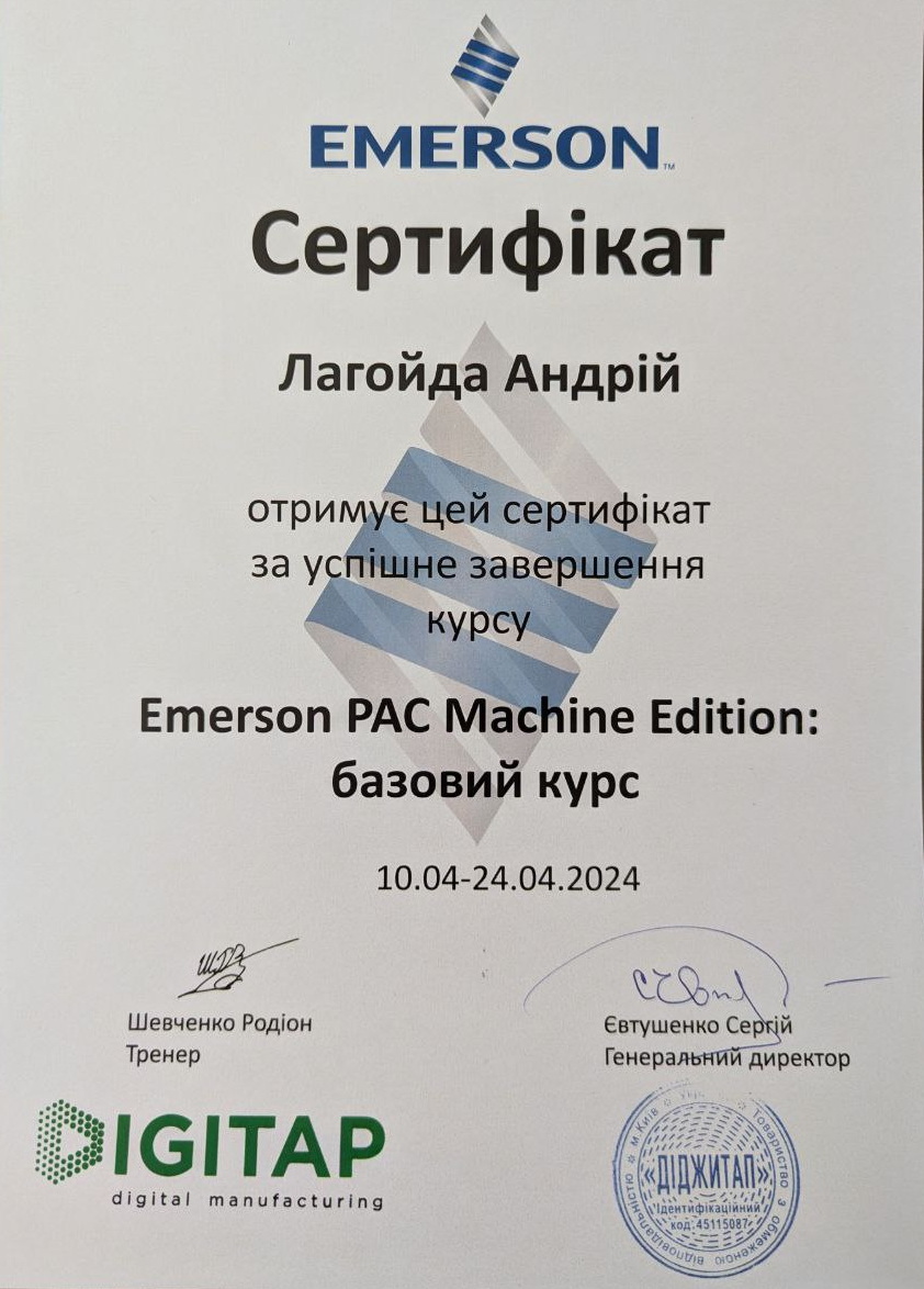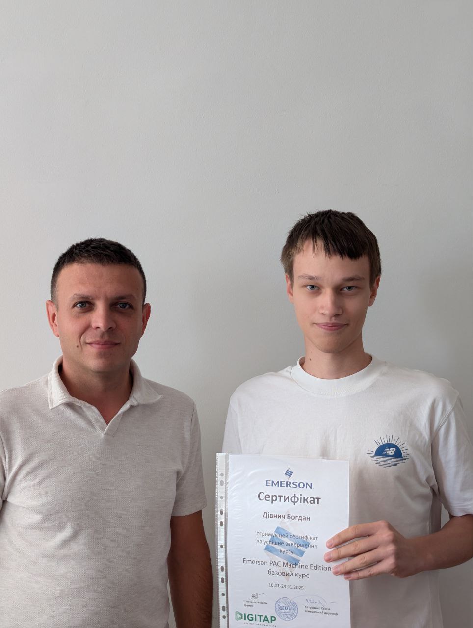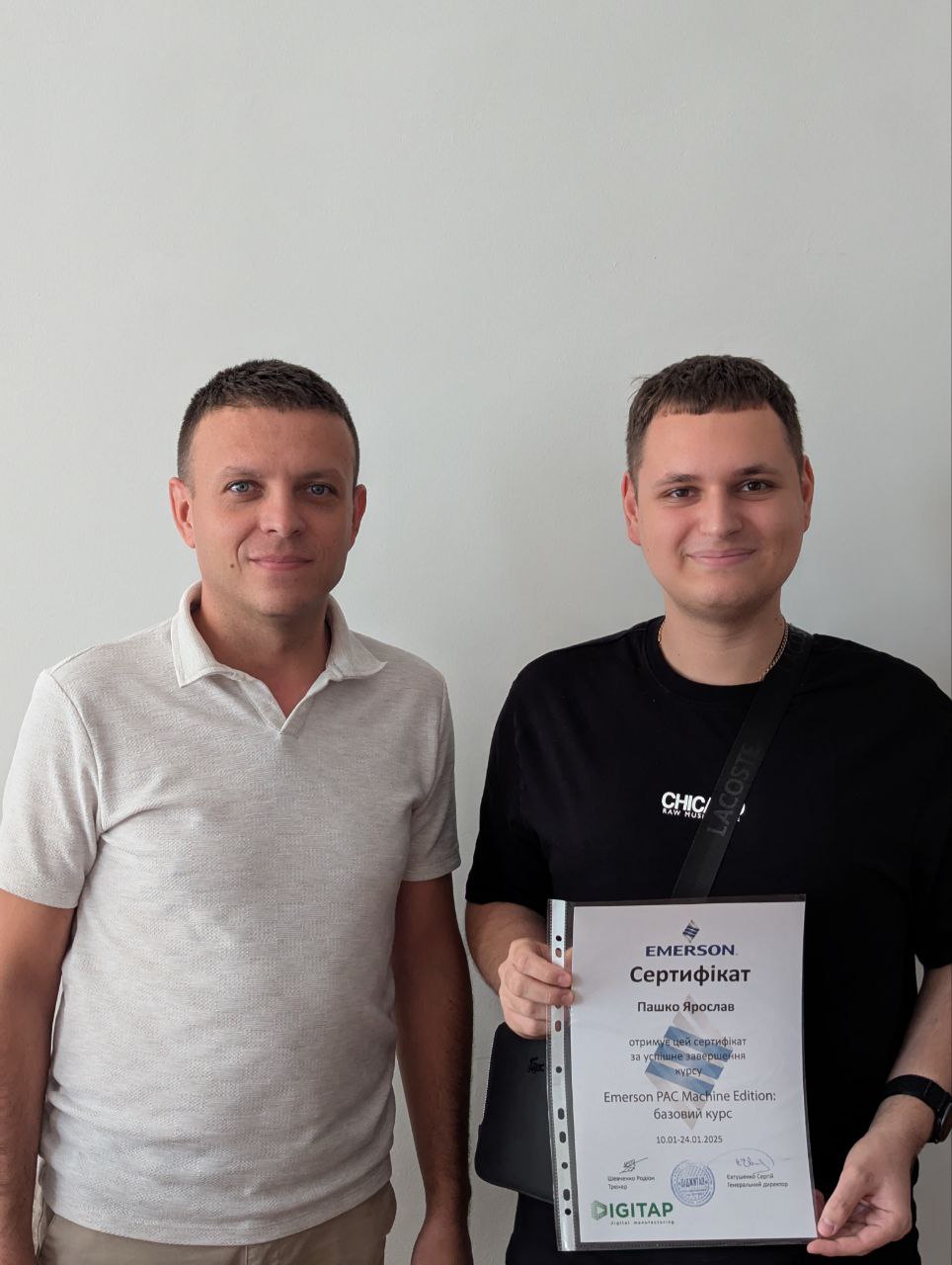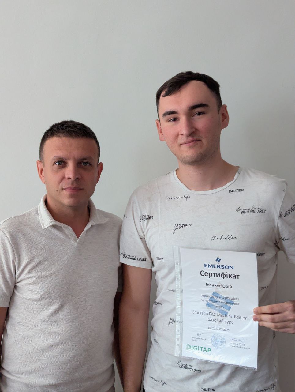 Днями завдяки співпраці та підтримці компанії ТОВ «ДІДЖИТАП», яка є офіційним дистриб’ютором EMERSON, глобального лідера у сфері технологій для автоматизації та управління промисловими процесами, студенти кафедри автоматизації та комп’ютерно-інтегрованих технологій пройшли сертифікацію по базовому курсу «Emerson PAC Machine Edition».