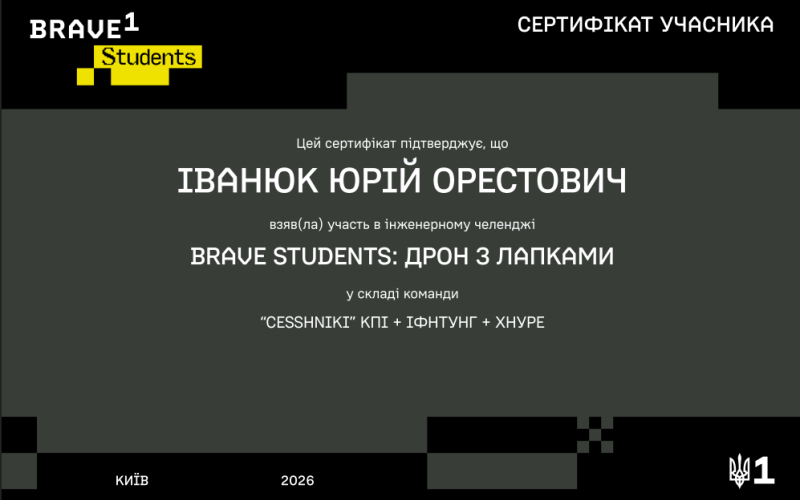 Юрій Іванюк разом із командою “CESSHNIKI” пройшов повний цикл розробки: від формування ідеї та проєктування до виготовлення прототипу й його тестування. Учасники не лише створювали рішення, а й презентували їх експертам, отримуючи зворотний зв’язок і можливості для подальшої співпраці з виробниками дронів.