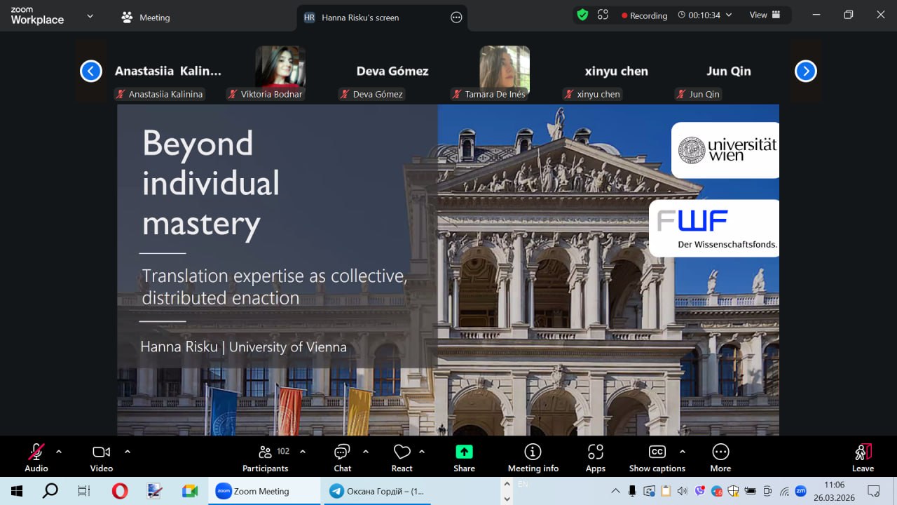 Сьогодні викладачі та студенти нашої кафедри – від першокурсників-бакалаврів до магістрів – стали частиною глобальної наукової дискусії, долучившись до онлайн-семінару видатної дослідниці Віденського університету професорки Ганни Ріску. Тема зустрічі «Beyond Individual Mastery» стала справжнім викликом традиційним уявленням про роботу перекладача, адже лекторка представила результати свого багаторічного етнографічного дослідження реальних робочих процесів у перекладацьких агенціях.