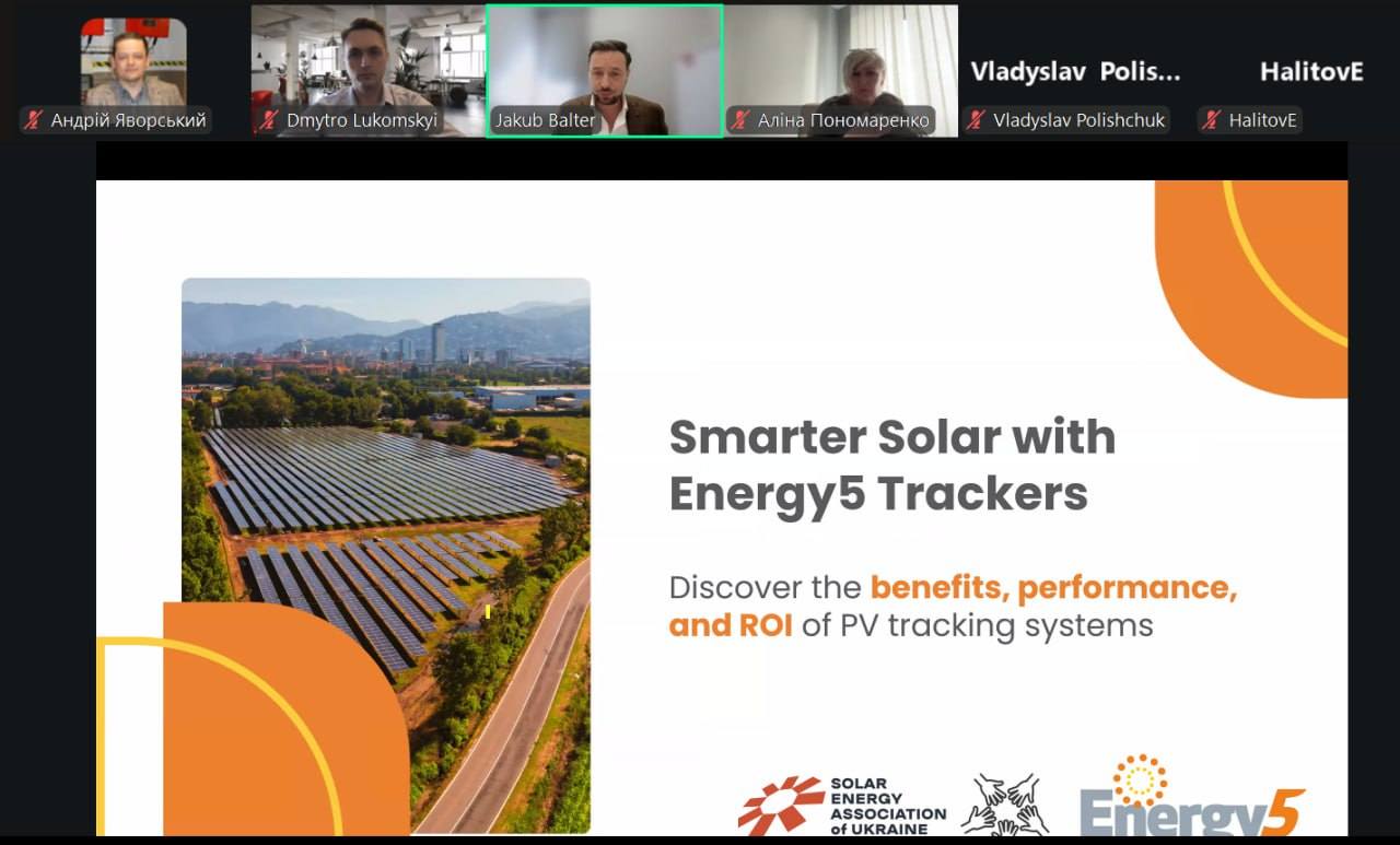 Даний вебінар був організований Асоціацію сонячної енергетики України разом з учасником АСЕУ – польською компанією Energy5. Представники компанії Energy5 презентували інноваційні рішення для підвищення ефективності роботи фотоелектричних станцій, а саме одновісні трекери, які дозволяють здійснювати переорієнтацію в просторі фотоелектричних модулів протягом дня для досягенення найвищих показників генерації. Застосування такого апробованого технологічного рішення дозволяє підвищити показники річної генерації станції на 13-18%. Додатковим бонусом, щодо роботи трекерної системи є ефективне смарт рішення, щодо очистки поверхні фотоелектричних модулів від снігу. Цікавими також, в плані реалізації даної трекерної системи були алгоритми захисту і роботи обладнання станції в плані вітрового навантаження та відсутності живлення зі сторони мережі.