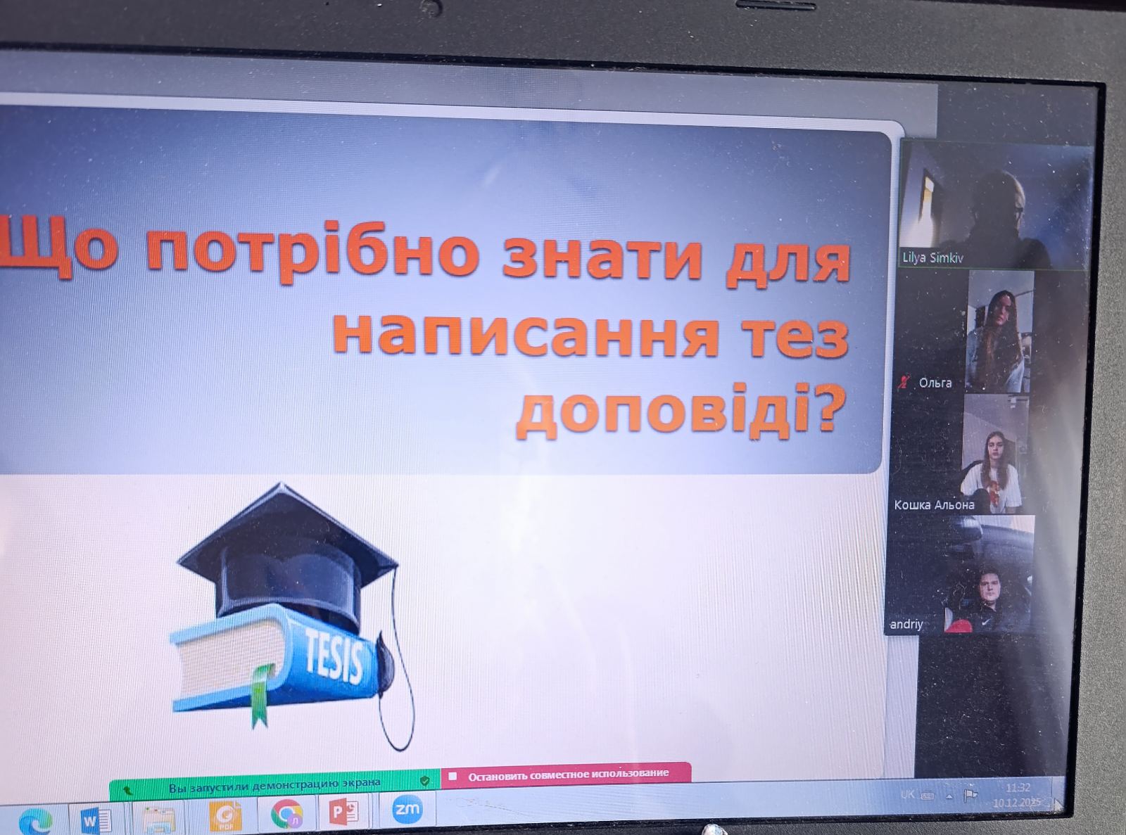 Учасники засідання ознайомилися зі структурою наукових тез, вимогами до їх оформлення та основними принципами представлення результатів дослідження. Під час зустрічі було розглянуто ключові елементи успішних тез: формулювання актуальності, постановку мети та завдань, опис методології дослідження, а також правила викладу отриманих результатів та висновків.