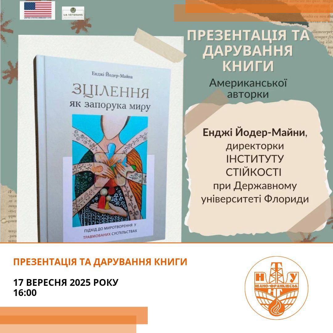 Запрошуємо вас на унікальну презентацію книги «ЗЦІЛЕННЯ як запорука миру» американської авторки досвідченої миротвориці та директорки Інституту стійкості при Державному університеті штату Флорида (США) – Енджі Йодер-Майни.