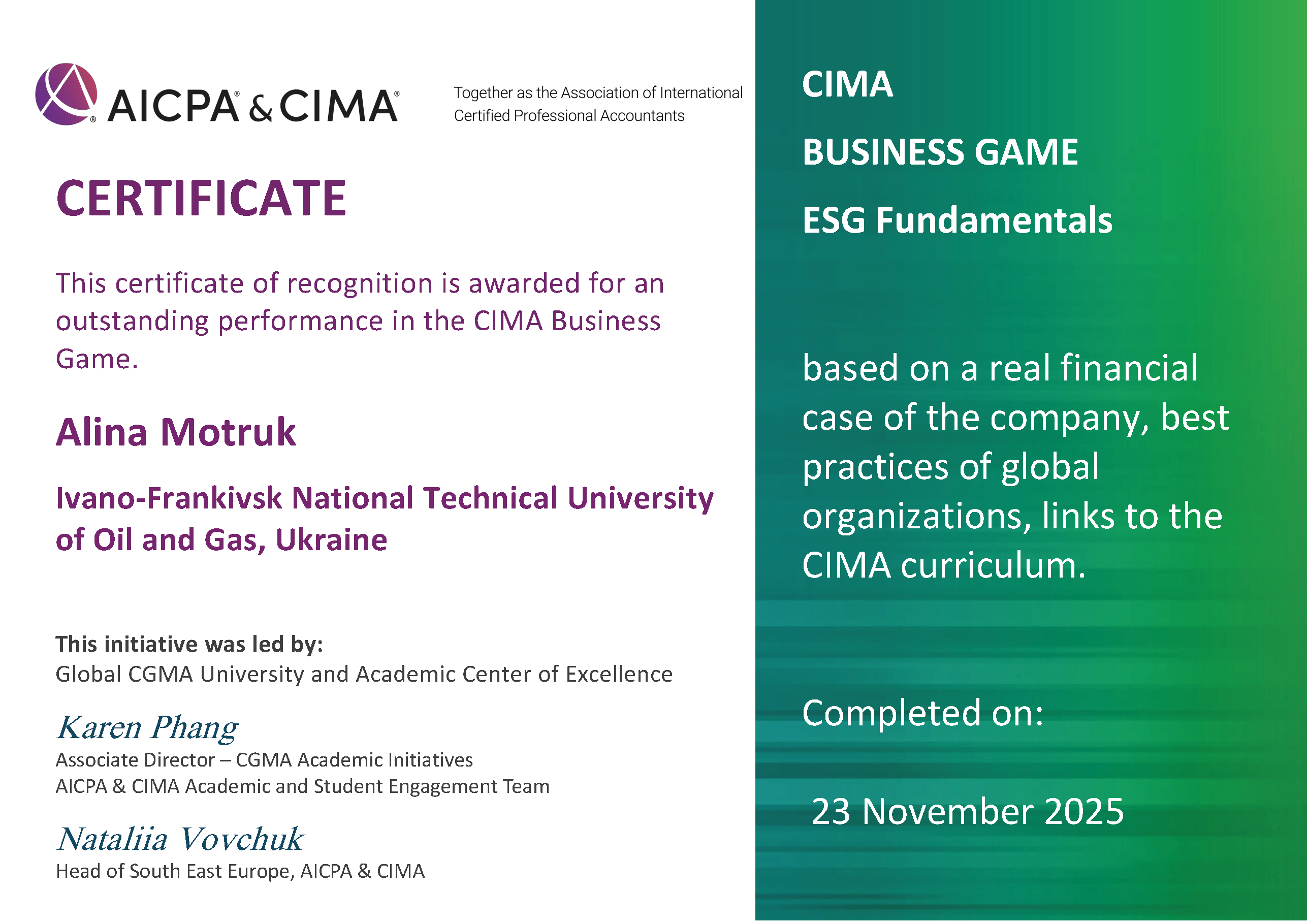 Окрема подяка — директору академічних ініціатив CGMA пані Karen Phang, а також команді CIMA Україна — Наталії Вовчук та Марині Зайцевій за підтримку та співпрацю. Спільні проєкти надихають нас ще активніше інтегрувати ESG-підходи в освітні програми й рухатися вперед у підготовці компетентних фахівців нового покоління.