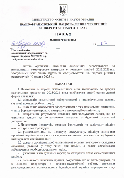 Академічної заборгованості за 2025/2026 field_attachment Наказ 354 Про ліквідацію академічної заборгованості за перше півріччя 2025-2026н.р..pdf1.33 МБ Додаткова інформація новин: Факультет природничих наук ОСТАННІ НОВИНИ вт, 23/12/2025 - 17:46 Рік зростання: підсумки та плани на майбутнє вт, 23/12/2025 - 12:45 Винахідники - для України вт, 23/12/2025 - 09:00 «Успіх у бізнесі» – курс, який працює для громади пн, 22/12/2025 - 14:12 Завершено щорічний екологічний моніторинг пн, 22/12/2025 - 14:10 ІФНТУНГ долучився до благодійного заходу «Різдвяна просфора» На думку фахівця вт, 07/01/2025 - 13:37 Унікальний рік в історії ІФНТУНГ пт, 18/10/2024 - 08:00 ТОЙ, ХТО ВМІЄ ПЕРЕМАГАТИ вт, 30/01/2024 - 10:00 Євстахій Крижанівський: «З допомогою вищої школи можемо вирішити будь-яку проблему» сб, 15/07/2023 - 16:40 Відбудова енергетичного сектору України й очищення довкілля всієї Європи від наслідків російсько-української війни пт, 31/03/2023 - 11:31 Українська ГТС у кризовому стані
