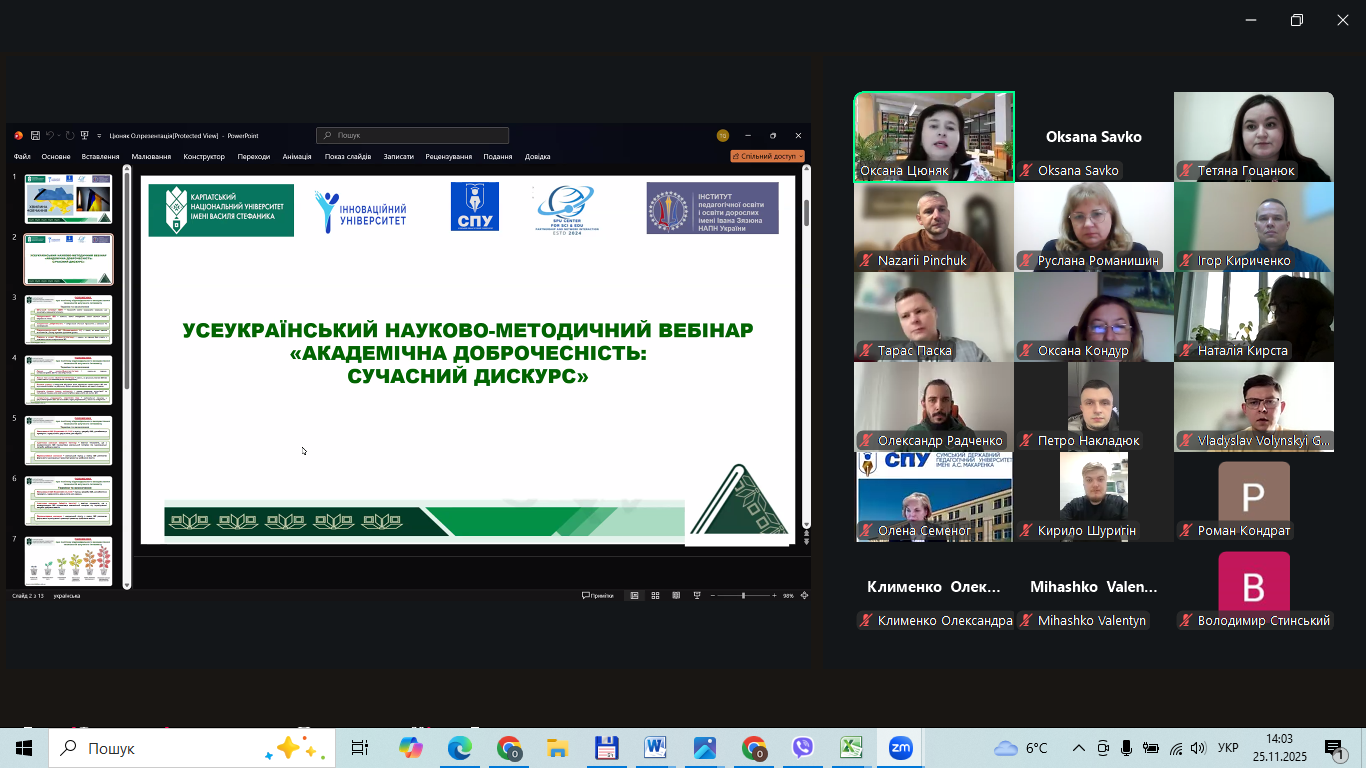 25.11.2025 року аспіранти ОНП "Економіка" доєднались до Усеукраїнського науково-методичного вебінару "Академічна доброчесність:сучасний дискурс". Метою заходу стало обговорення актуальних проблем забезпечення академічної доброчесності в освітньому та науковому середовищі; аналіз сучасних викликів, а також практик, спрямовані на формування культури етики, відповідальності і прозорості в науковій діяльності.