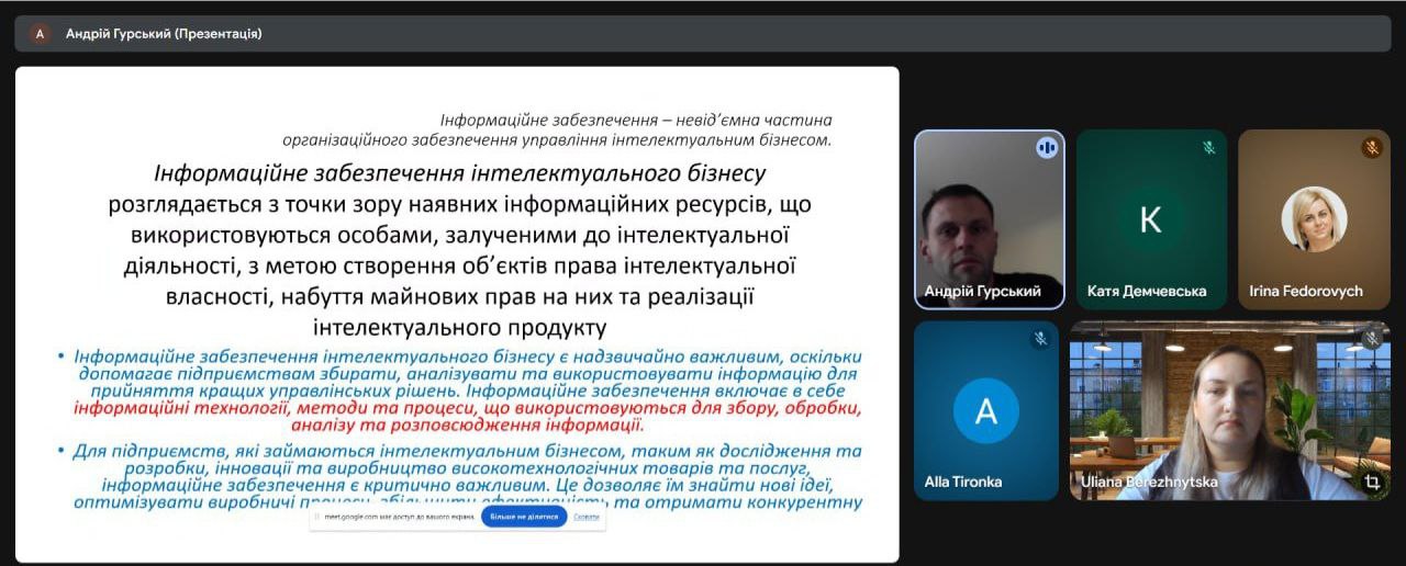21 жовтня 2025 року для магістрантів 1 курсу освітньо-професійної програми "Економіка інноваційного розвитку" спеціальності С1 "Економіка та міжнародні економічні відносини" було проведено бінарне заняття з дисципліни "Інтелектуальний бізнес". Гостьовим лектором від стейкхолдерів виступив розробник програмного забезпечення компанії Софтсерв Андрій Гурський, який представив тему: "Організаційне забезпечення управління інтелектуальним бізнесом". Лекція була присвячена двом ключовим питанням: