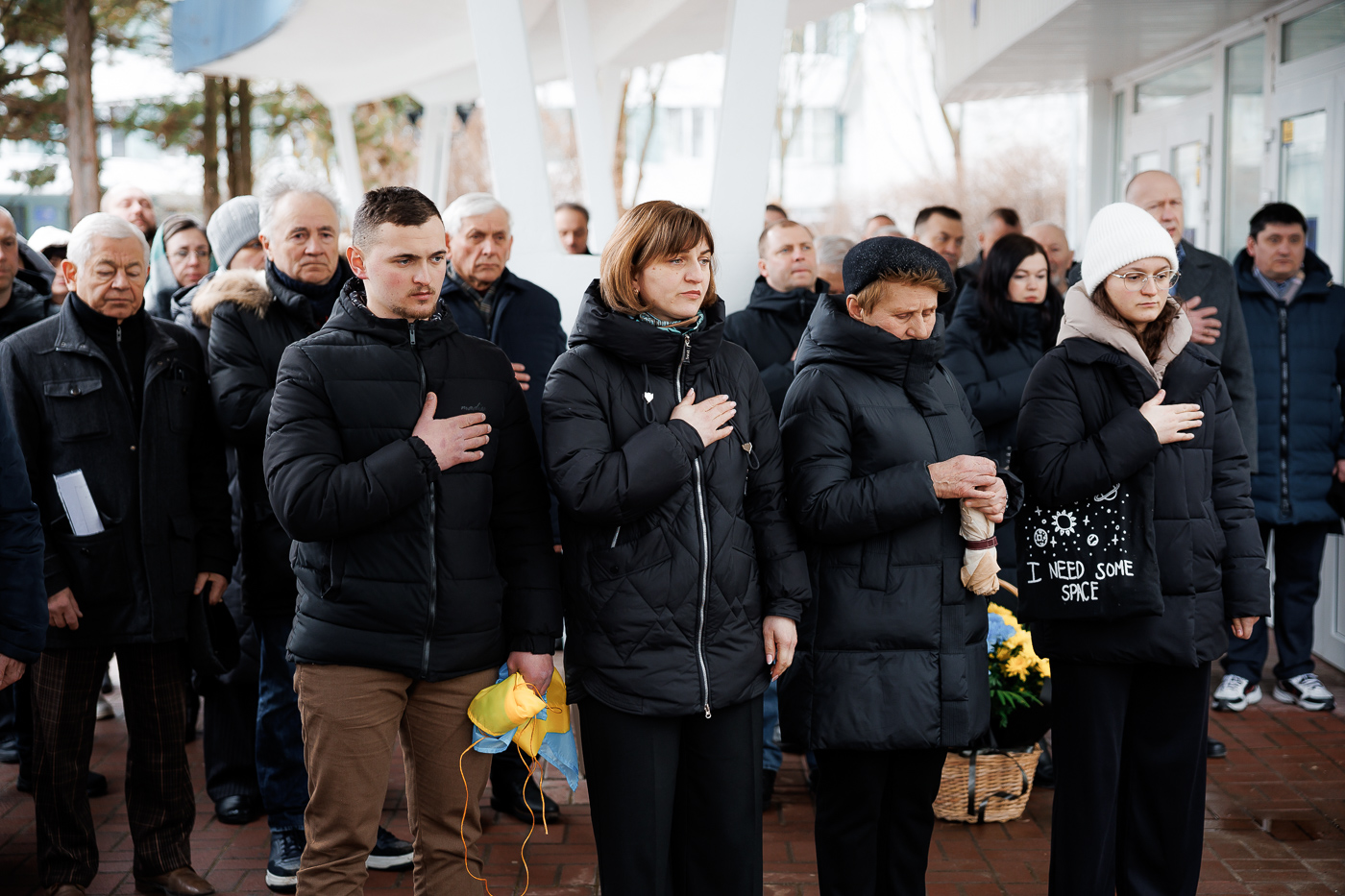 Цього дня сама природа ніби розділяла людський біль — дощ, перемішаний зі снігом, тихо падав на землю. А з меморіальної дошки дивилися лагідні очі воїна — на тих, кого він любив понад усе: матір, дружину, дітей.