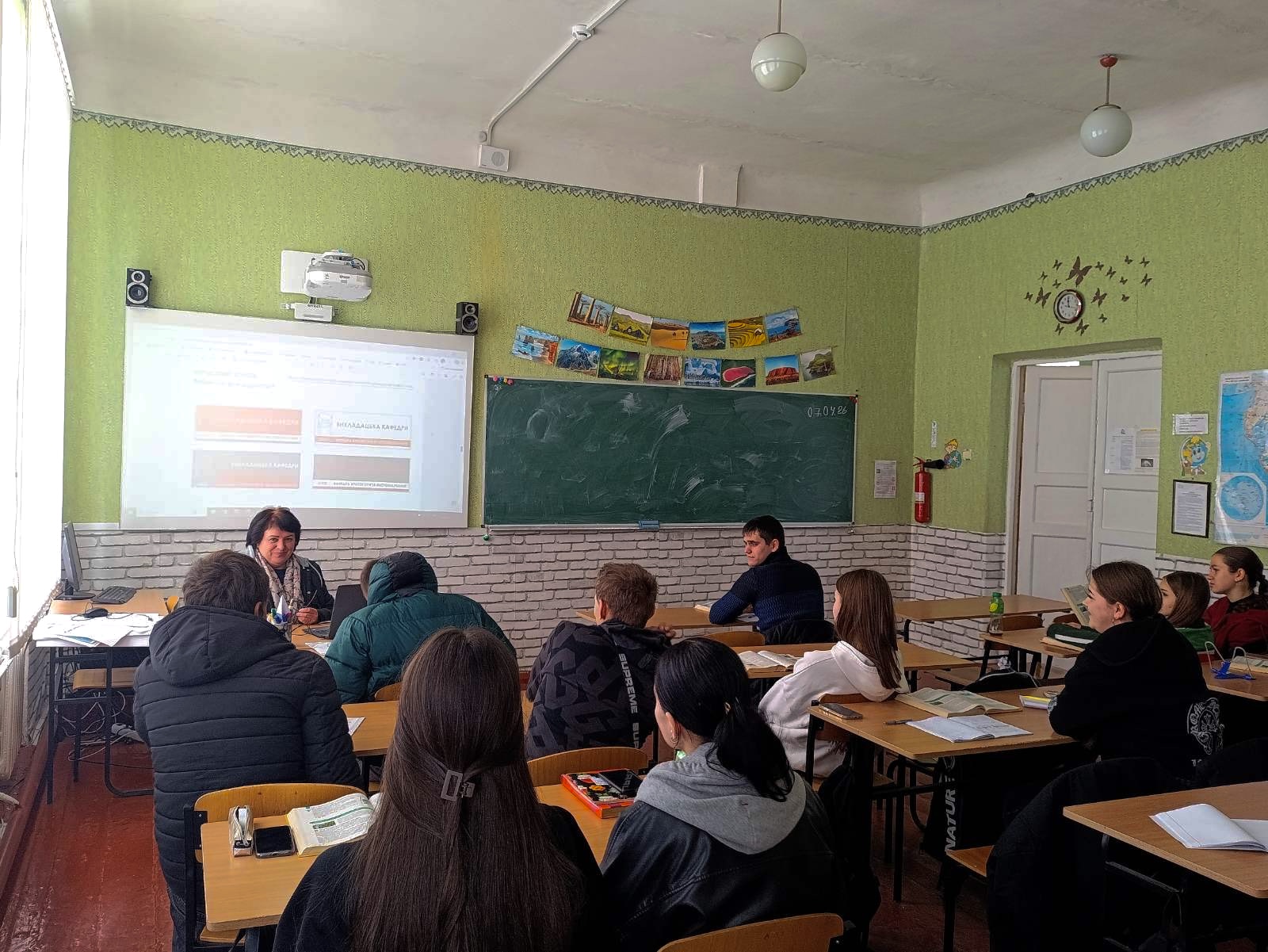 Зустріч відбулася у Мурафському ліцеї Богодухівського району Харківської області з учнями 11-А класу (вчитель – Людмила Шопінська). До організації заходу долучилися викладачка кафедри англійської мови Надія Іонане, а також студент групи НІВ-25-3 Дмитро Грищенко – випускник цього ліцею, який має власний досвід навчання в умовах постійних тривог, обстрілів і бомбардувань – досвід, який для багатьох сьогодні, на жаль, є спільним.