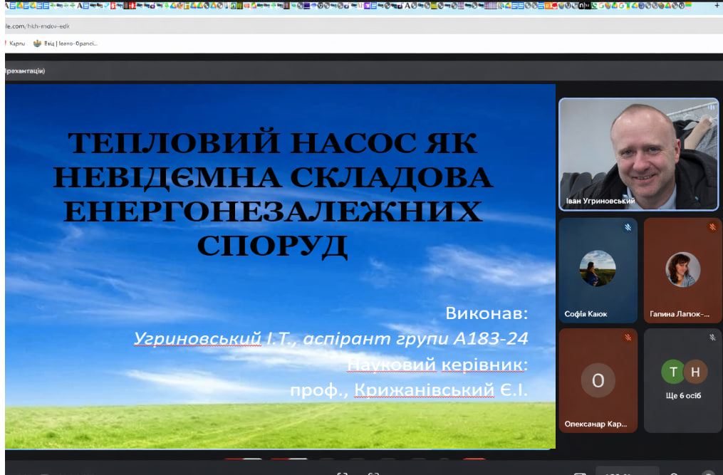 Перший досвіт аспіранта Угриновського І. у проведенні лекції для студентів спеціальності Технології захисту навколишнього середовища на тему "Тепловий насос як невід’ємна складова енергонезалежних споруд". Лекція присвячена тепловим насосам як ключовому елементу енергонезалежних та енергоефективних будівель. У ній розглянуто принцип роботи теплового насоса на основі зворотного циклу Карно, показник енергоефективності COP, основні типи теплових насосів, їхні переваги та обмеження. Окрему увагу приділено практичним прикладам використання теплових насосів у реальних об’єктах, зокрема з використанням енергії міської каналізації, а також перспективним технологіям на основі CO₂ як екологічно безпечного холодоагенту. Лекція демонструє, що теплові насоси є сучасним рішенням для зменшення викидів CO₂, скорочення споживання викопного палива та формування сталого енергетичного майбутнього.