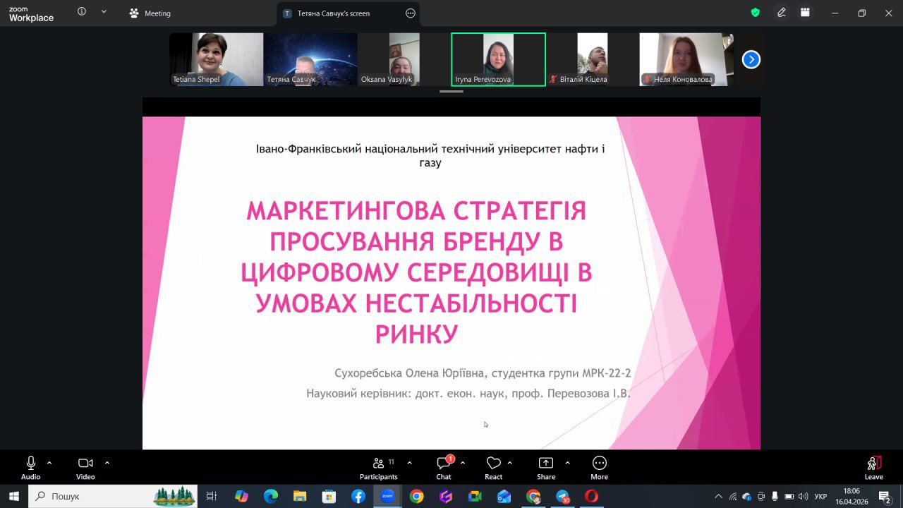 1 місце - Сухоребська О. Ю. (МРК-22-2), (наук. керівник: д. е. н, проф. Перевозова І.В.) з темою доповіді: Маркетингова стратегія просування бренду в цифровому середовищі в умовах нестабільності ринку