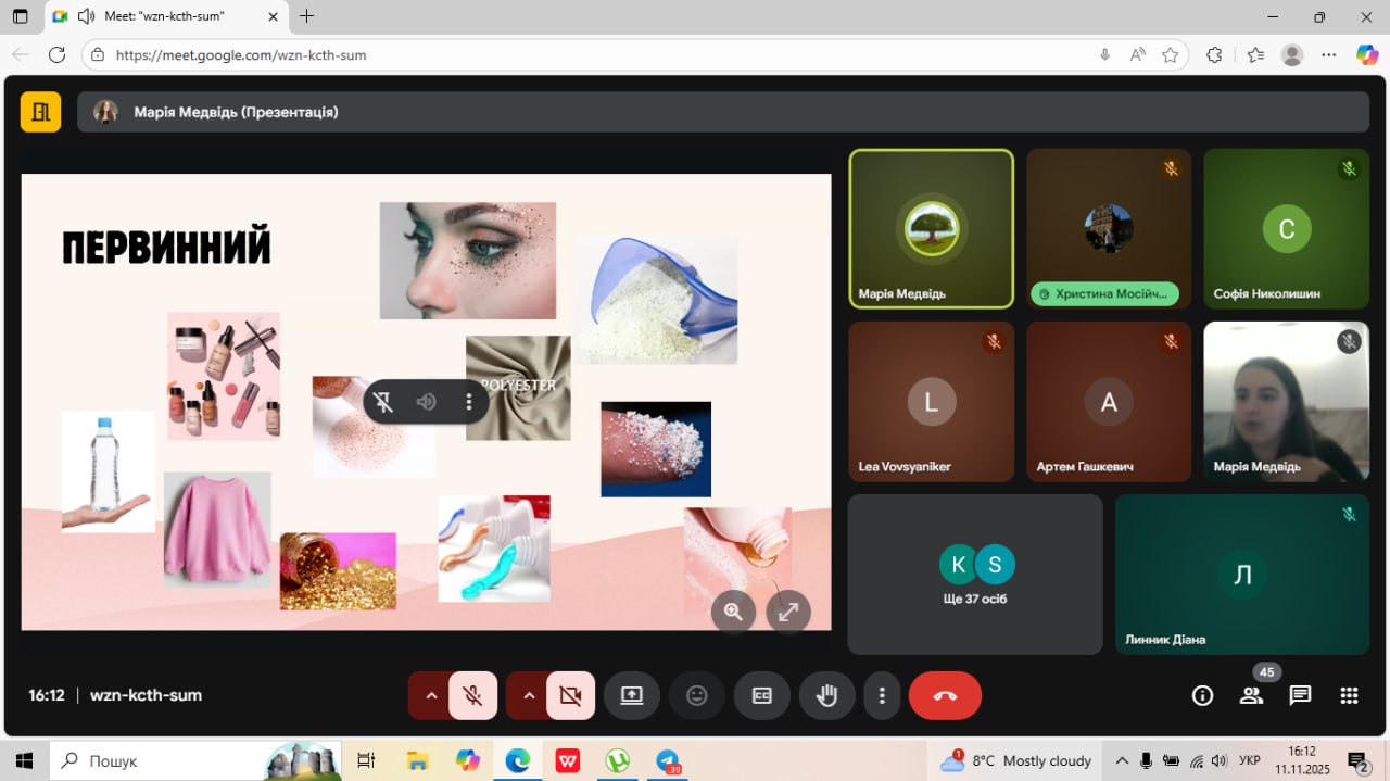 Продовжуємо GreenWeek#IF, який розпочався 10 листопада 2025 року. Серію онлайн-зустрічей відкрив тренінг на тему «Мікропластик. Розслідування, яке починається у твоїй шафі», який провела студентка магістратури спеціальності технології захисту навколишнього середовища Марія Медвідь. Школярі дізналися про проблему забруднення довкілля мікропластиком, роль мікропластику у нашому щоденному житті та отримали практичні поради, щодо зменшення впливу мікпропластику на їх здоров'я. Учасники зустрічі активно долучатися до обговорення представленої Марією тематики та ділилися власними думками. Наприкінці зайняття учні пройшли тематичне опитування.