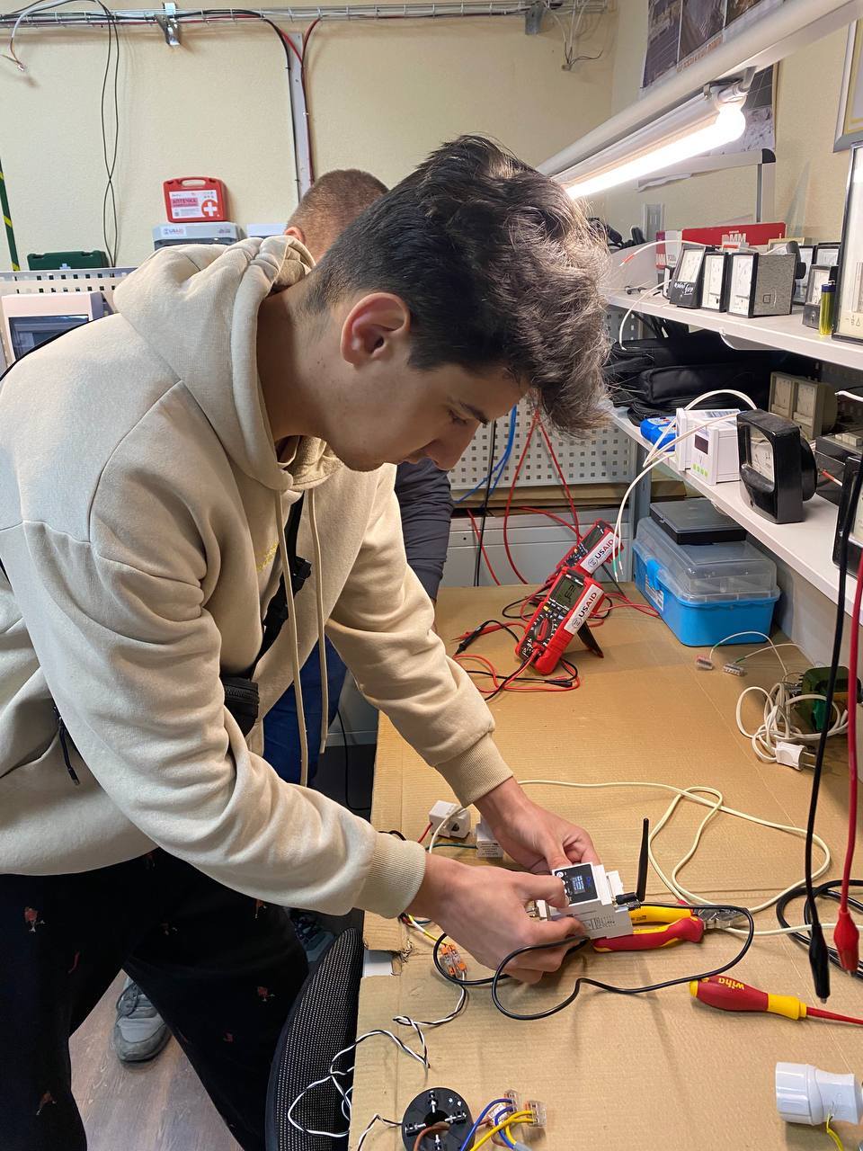 керівництвом доцента кафедри інформаційно-вимірювальних технологій та енергетичного менеджменту Андрія Яворського студенти-гуртківці, які є оночасно працівниками компанії "СТЕМ Кепітал", Максим Ковбанюк (ЕТМм-25-1) і Роман Парандій (ІВЕ-22-1) підібрали відповідний трансформатор струму, налаштували та перевірили роботу смарт-лічильника на дослідному стенді. Після цього засіб вимірювання був успішно інстальований нашими фахівцями-гуртківцями для задачі обмеження потужності в процесі роботи гібридної фотоелектричної станції (відпочинковий комплекс в с. Яблуниця).