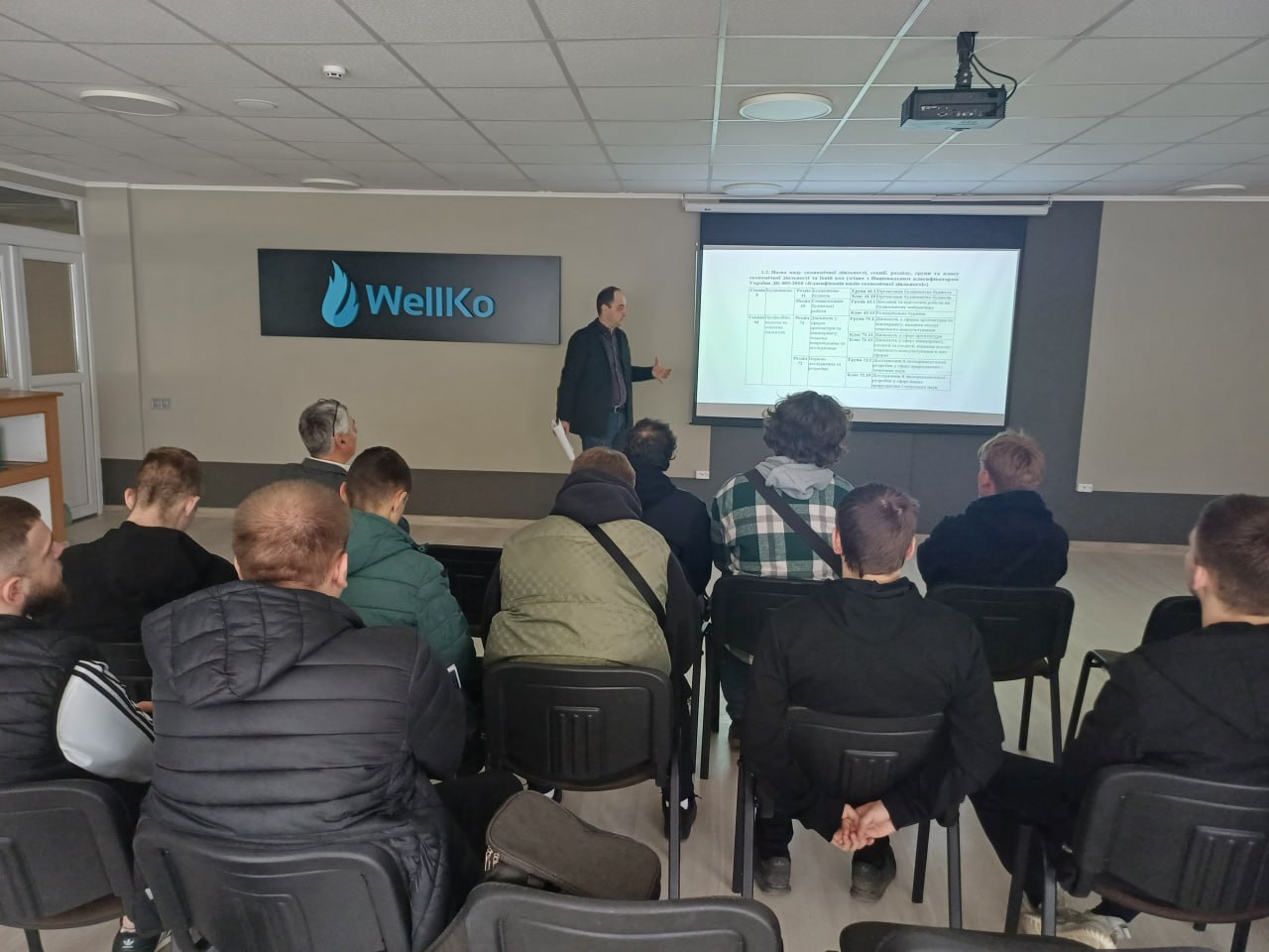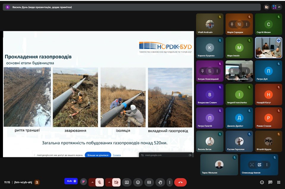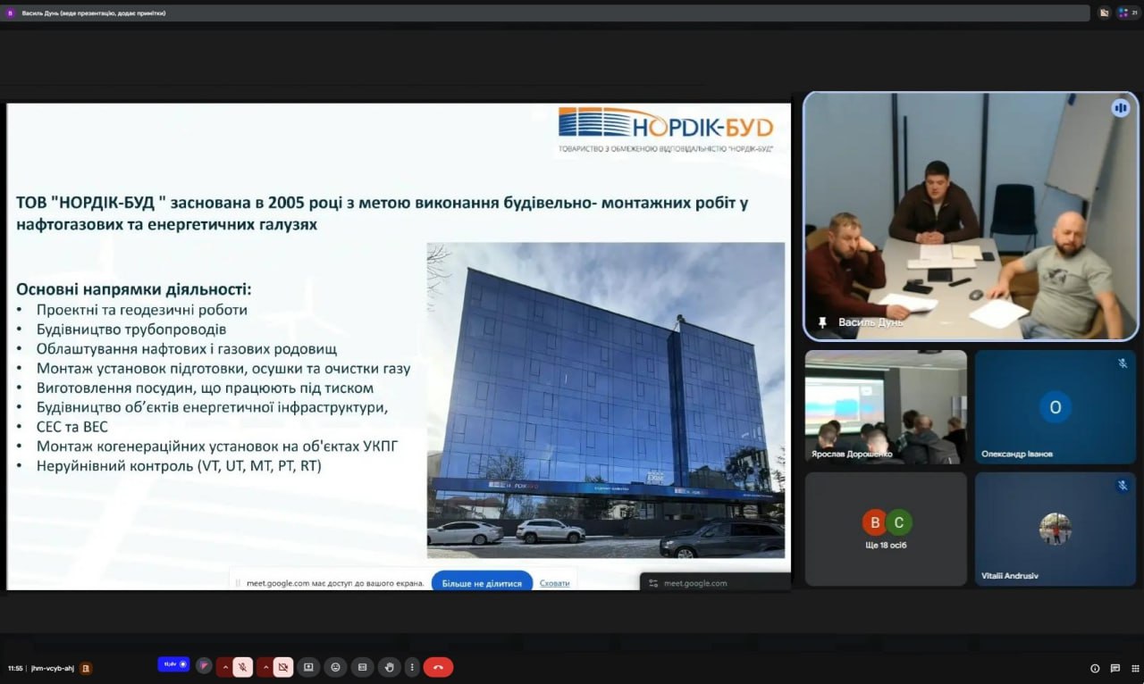 підприємства, зокрема будівництво трубопроводів, облаштування нафтових і газових родовищ, монтаж установок підготовки, осушки та очистки газу, а також спорудження об’єктів енергетичної інфраструктури. Особливу увагу було приділено реалізованим проєктам зі створення інфраструктури видобування та підготовки газу, а також об’єктам відновлюваної енергетики — сонячним і вітровим електростанціям. Значний інтерес у слухачів викликали питання монтажу когенераційних установок. Лектор також акцентував на виробничій базі підприємства, кадровому потенціалі, спеціалізованій техніці та дозвільній документації, необхідній для виконання робіт підвищеної небезпеки.