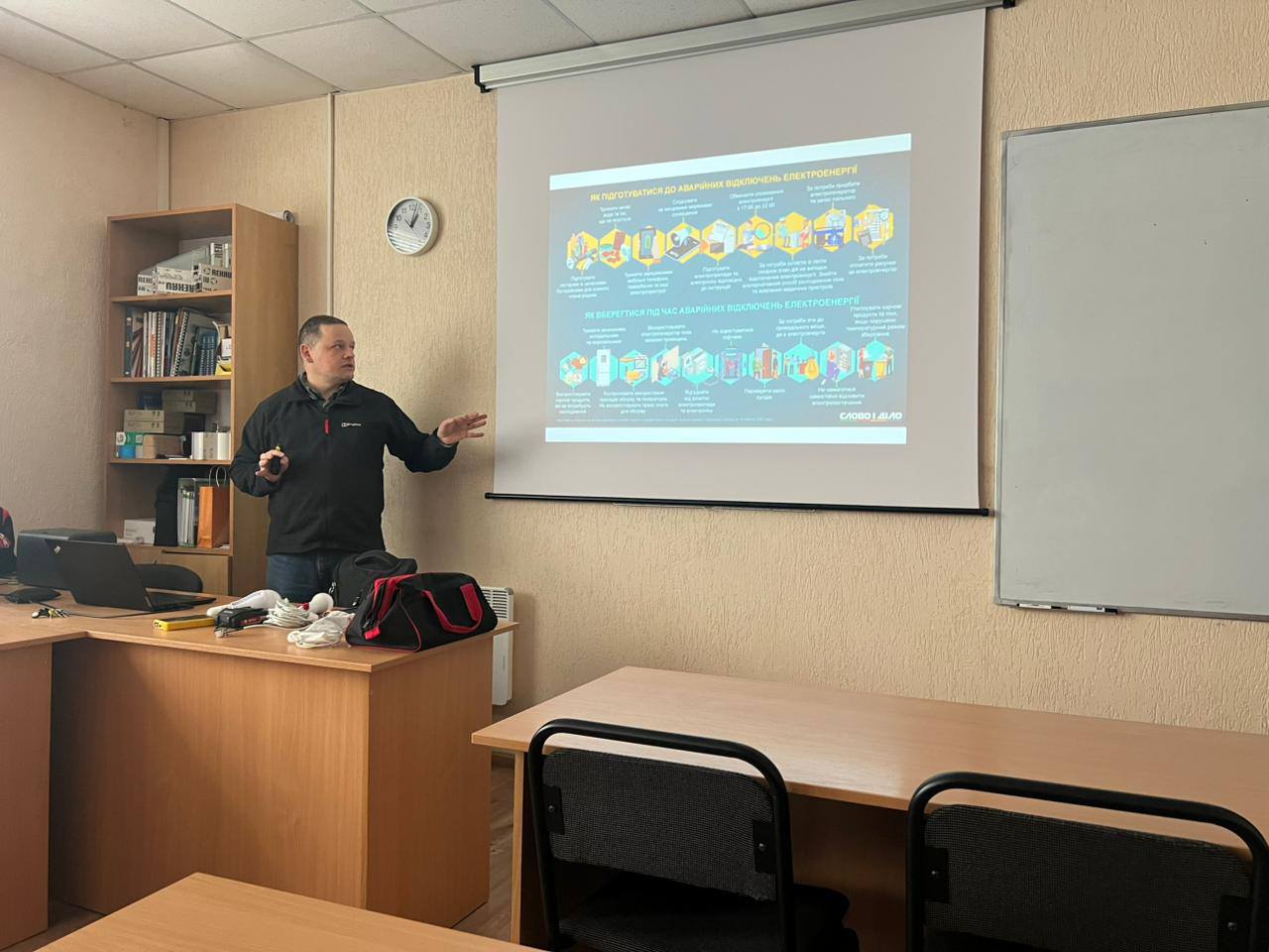 Даний авторський тренінг проводив керівник гуртка, доц. каф. ІВТЕМ Яворський Андрій. Такий тренінг для наших студентів ведеться і постійно вдосконалюється вже з 2022 року. На тренінгу наші студенти дізнались як і за допомогою чого можна задовільнити базові потреби під час вимкнення електричної енергії – освітлення, заряджання мобільних пристроїв, водопостачання, зв'язок, забезпечення і побудова надійних систем резервного живлення.