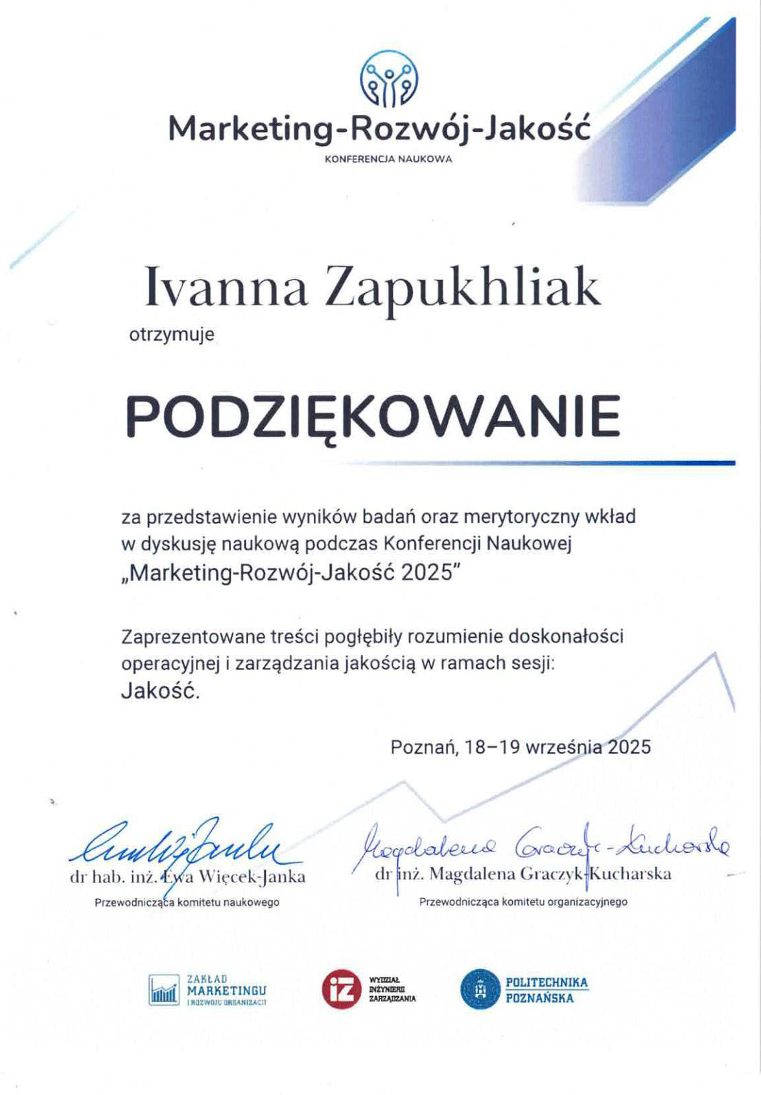 Професор кафедри менеджменту та адміністрування Запухляк І.Б. та доцент кафедри менеджменту та адміністрування Вербовська Л.С. взяли участь в ІІ науковій конференції «Konferencja Marketing-Rozwój-Jakość» яка відбувалася 18 та 19 вересня 2025 року в місті Познань на базі Політехніки Познанської, представивши доповідь на тему «Ocena efektywności szkolnictwa wyższego w Ukrainie z perspektywy integracji europejskiej» (prof. dr. hab. Ivanna Zapukhliak, dr Lesya Verbovska, dr hab. inż. Maciej Szafrański) (https://www.linkedin.com/company/marketing-rozwoj-jakosc/posts/?feedView=all)