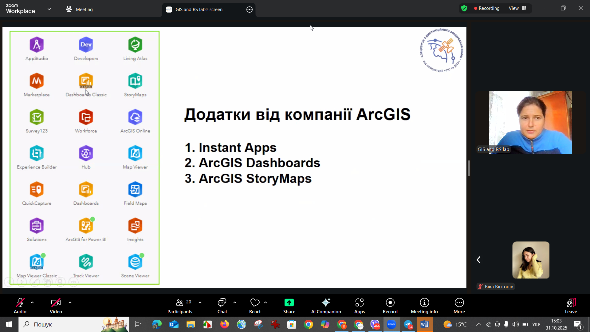 31 жовтня 2025 р. магістри та бакалаври спеціальності 193 – Геодезія та землеустрій, гаранти освітніх програм, а також викладачі кафедри геодезії та землеустрою взяли участь у онлайн-занятті "Створення вебдодатків в середовищі ArcGIS Online", проведеному кандидаткою технічних наук, старшою співробітницею Наукового центру аерокосмічних досліджень Землі Інституту геологічних наук НАНУ, Ольгою ТОМЧЕНКО, на запрошення доцентки кафедри геодезії та землеустрою Лідії ДАВИБІДИ.