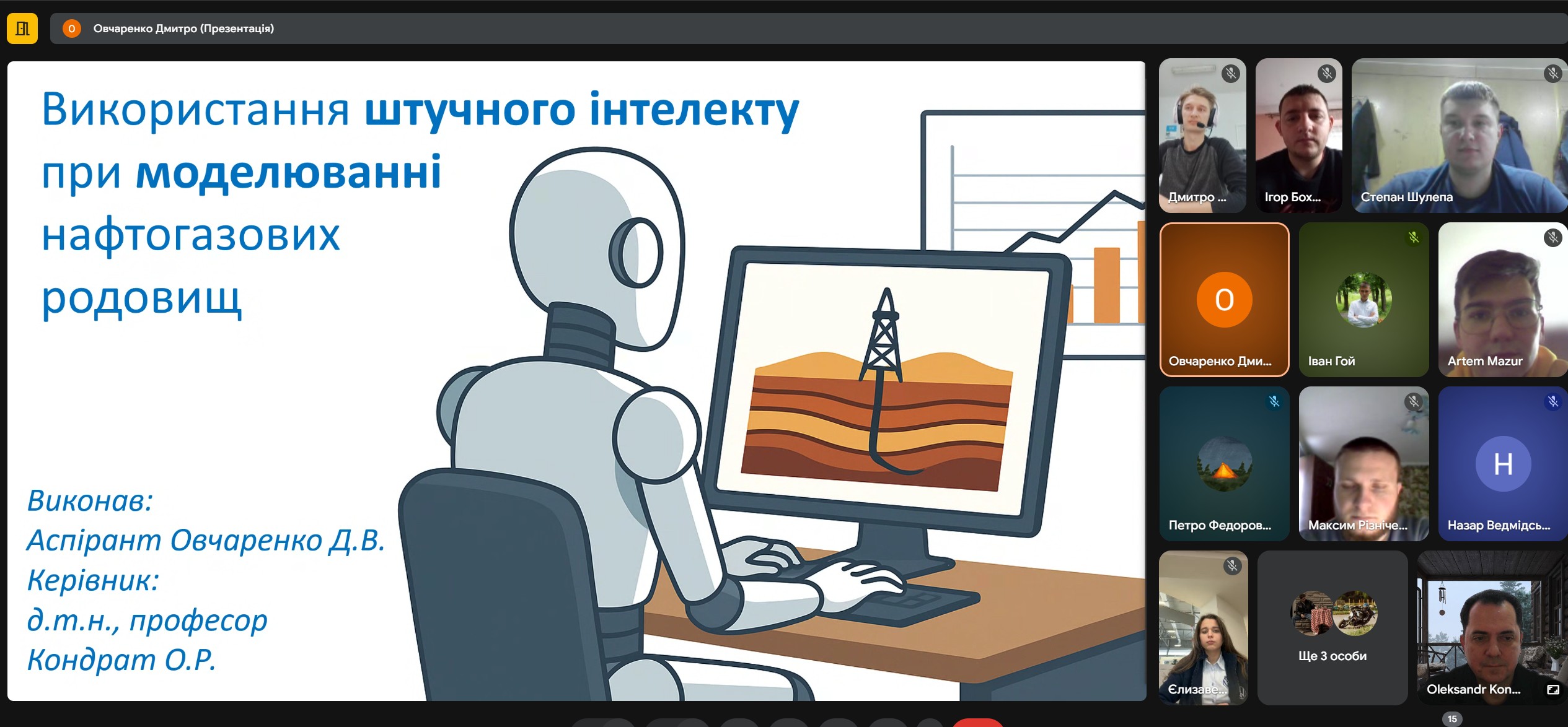 09.12.2025 р. аспіранти кафедри видобування нафти і газу спеціальності 185 "Нафтогазова інженерія та технологія" ОНП "Нафтогазова інженерія та технологія" (гарант - професор Ярослав Дорошенко) спробували себе у ролі викладачів. Молоді науковці, які прослухали курс «Педагогічний практикум» (лектор — проректор з наукової роботи ІФНТУНГ, професор Олександр КОНДРАТ), успішно провели свої лекції для колег-аспірантів та здобувачів другого (магістерського) рівня вищої освіти ОП «Видобування нафти і газу». Це була не просто лекція, а реальний обмін досвідом та знаннями. Дмитро Овчаренко (аспірант 2-го року навчання кафедри ВНГ) презентував тему «Використання штучного інтелекту (ШІ) при моделюванні нафтогазових родовищ». Для слухачів це стало чудовою нагодою поглянути на актуальні проблеми галузі очима дослідників, які працюють над ними прямо зараз