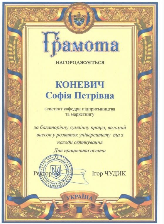 Викладачі кафедри підприємництва та маркетингу — Коневич Софія Петрівна, Дюк Оксана Михайлівна та Дуда Галина Богданівна — були нагороджені грамотами з нагоди Дня працівника освіти.